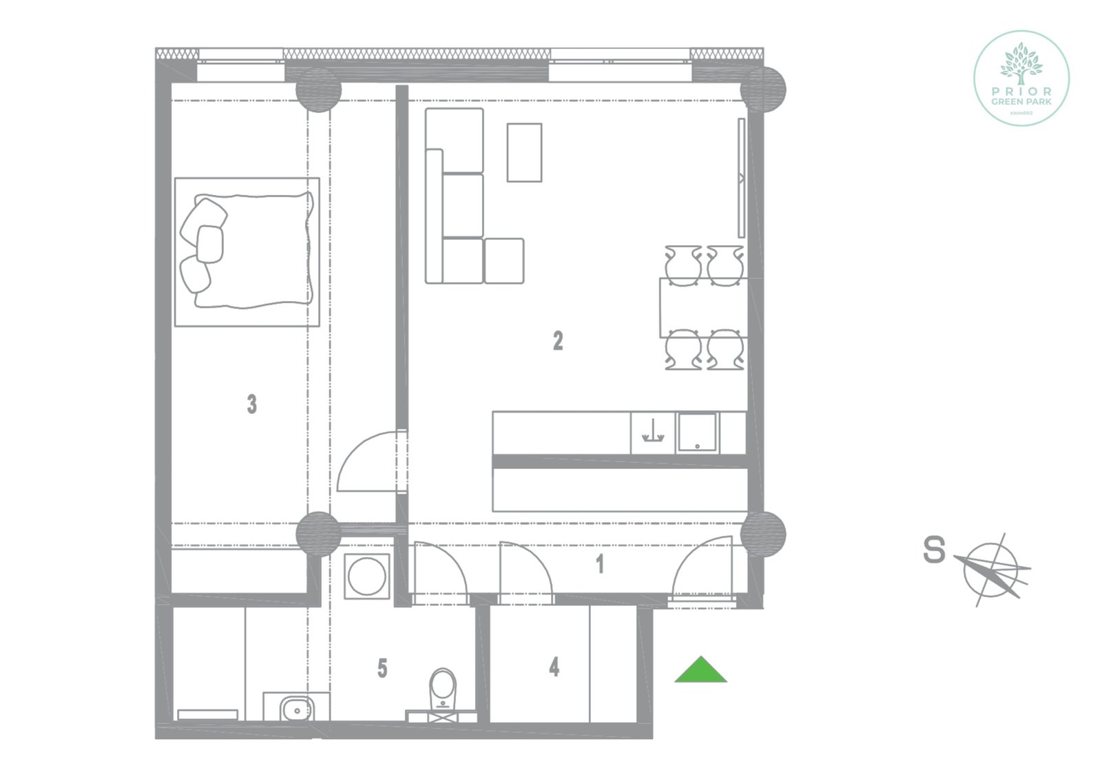 Schéma půdorysu bytu představuje předpokládané dispoziční řešení. Kuchyňské linky, nábytek a interiérové doplňky nejsou předmětem dodávky. Výměry jednotlivých místností jsou pouze orientační. Investor se tímto nevzdává práva na případné úpravy či doplnění marketingového materiálu.