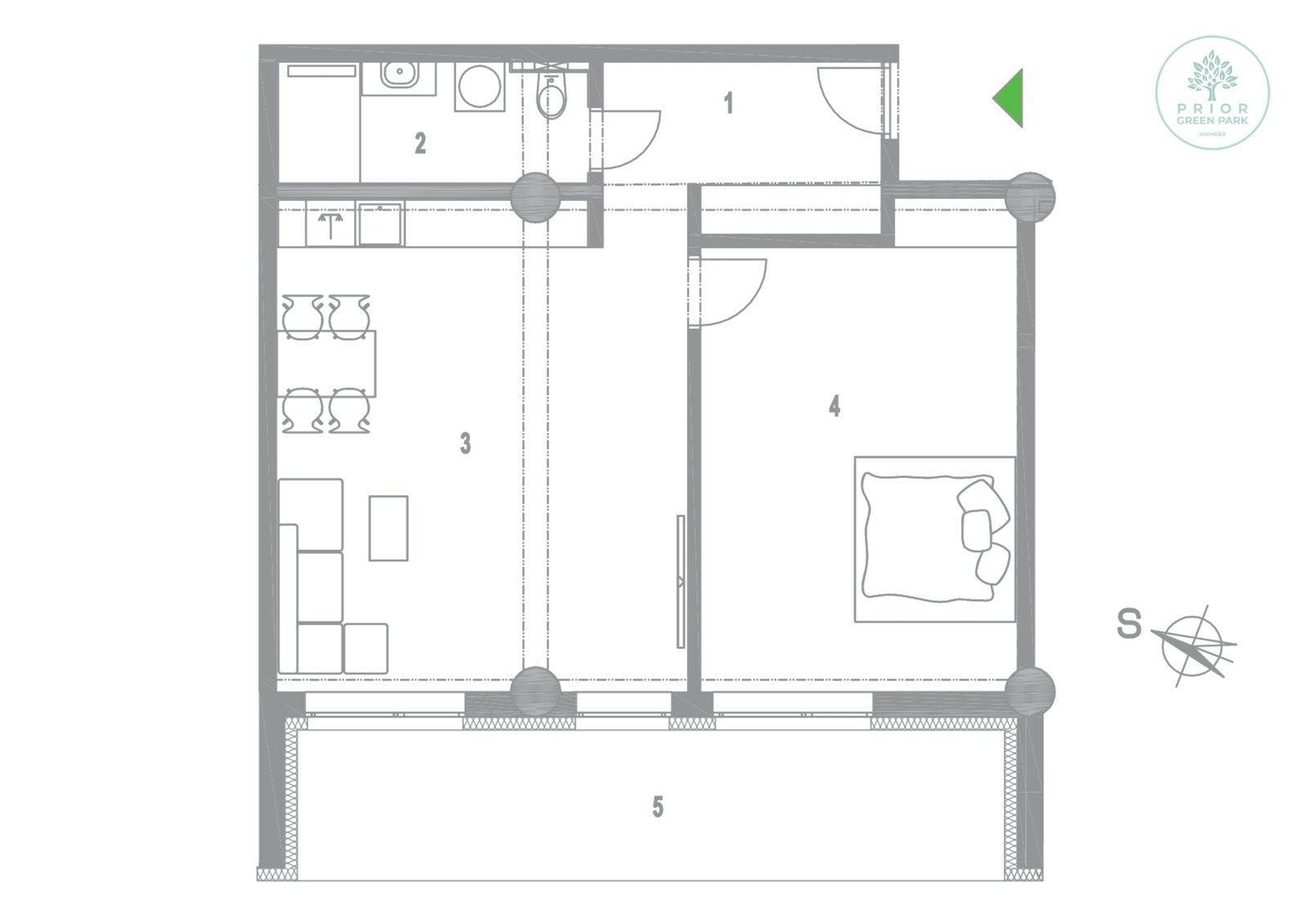 Schéma půdorysu bytu představuje předpokládané dispoziční řešení. Kuchyňské linky, nábytek a interiérové doplňky nejsou předmětem dodávky. Výměry jednotlivých místností jsou pouze orientační. Investor se tímto nevzdává práva na případné úpravy či doplnění marketingového materiálu.