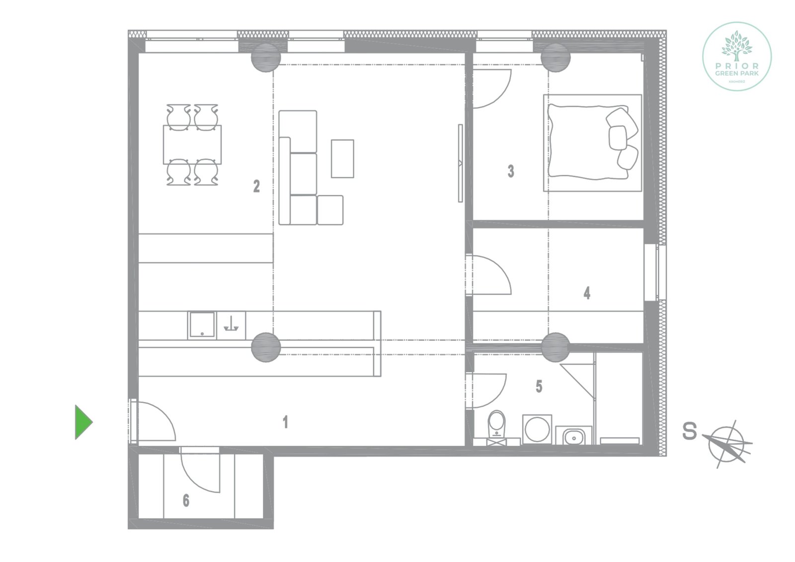 Schéma půdorysu bytu představuje předpokládané dispoziční řešení. Kuchyňské linky, nábytek a interiérové doplňky nejsou předmětem dodávky. Výměry jednotlivých místností jsou pouze orientační. Investor se tímto nevzdává práva na případné úpravy či doplnění marketingového materiálu.