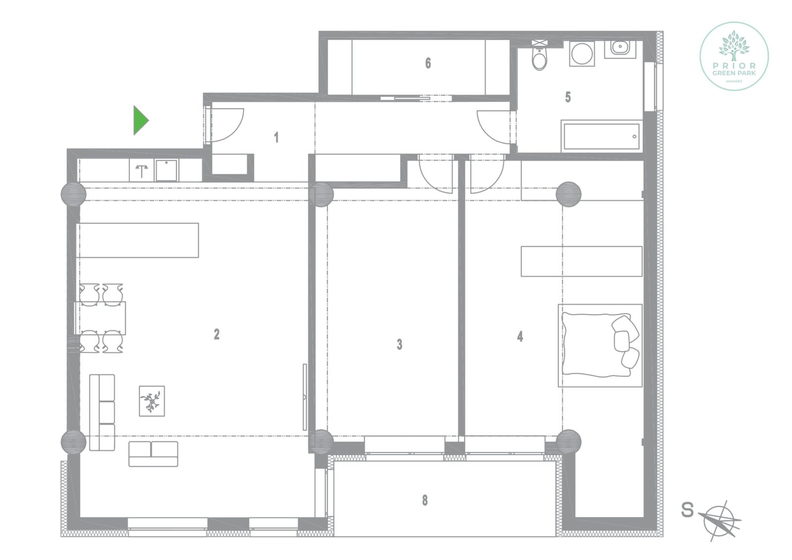 Schéma půdorysu bytu představuje předpokládané dispoziční řešení. Kuchyňské linky, nábytek a interiérové doplňky nejsou předmětem dodávky. Výměry jednotlivých místností jsou pouze orientační. Investor se tímto nevzdává práva na případné úpravy či doplnění marketingového materiálu.