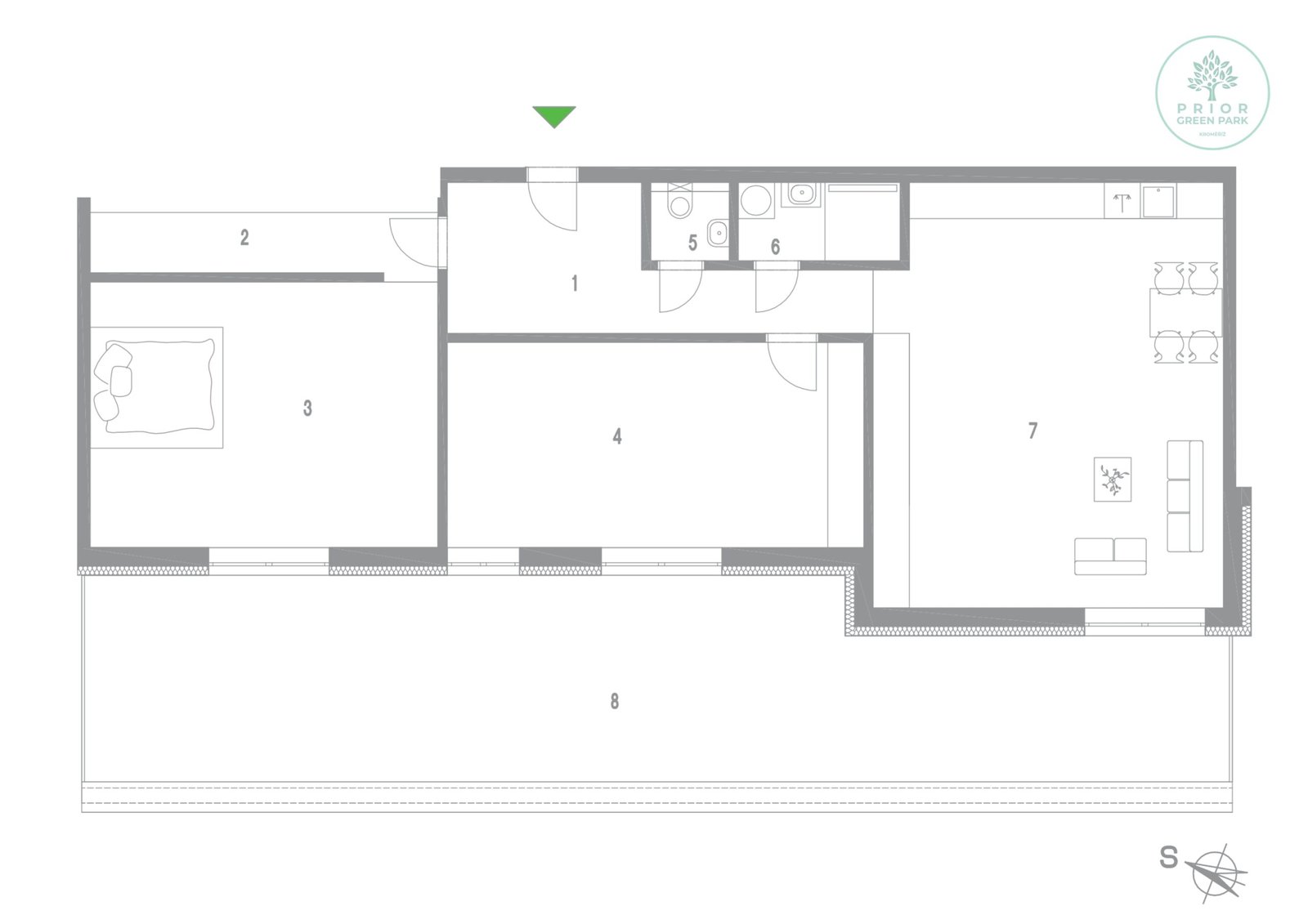 Schéma půdorysu bytu představuje předpokládané dispoziční řešení. Kuchyňské linky, nábytek a interiérové doplňky nejsou předmětem dodávky. Výměry jednotlivých místností jsou pouze orientační. Investor se tímto nevzdává práva na případné úpravy či doplnění marketingového materiálu.